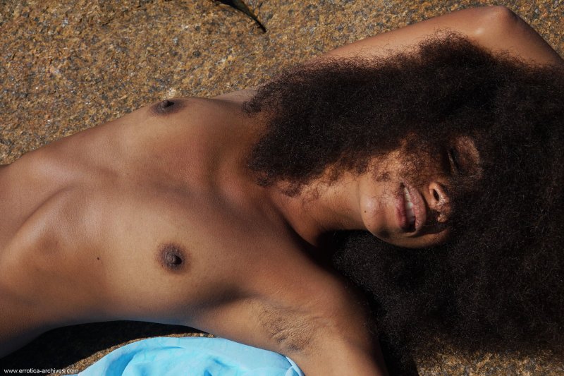 Прикрываясь платочком, полностью обнаженная негритянка с лохматой киской устраивается на камнях у моря и начинает эротично позировать, наслаждаясь процессом и мило улыбаясь. В дальнейшем стройняшка с маленькими сиськами ложится на спину и раздвигает ножки, моментально открывая перед нами волосатую киску с заросшим лобком, а перевернувшись на живот, девушка демонстрирует попку.