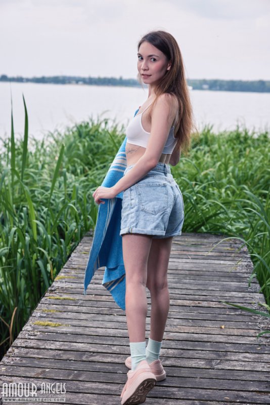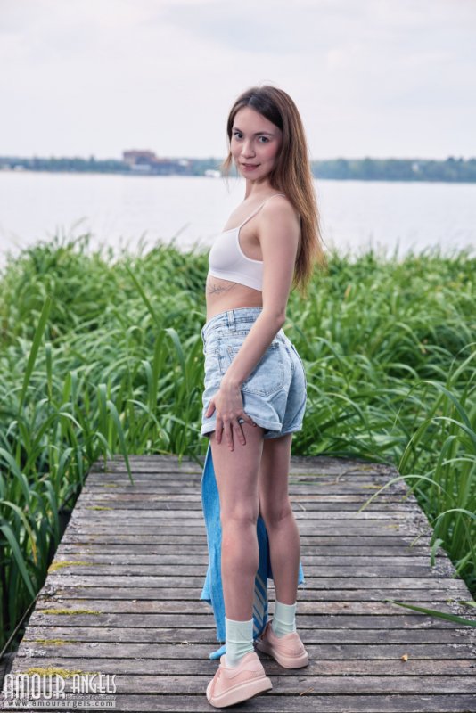 Удобно устроившись на пирсе на берегу озера, бесстыжая молодая простушка в коротких шортиках устроила настоящий стриптиз на природе. Дерзко срывая перед камерой всю одежду, стройная девица оголила под ней свои маленькие сиси и, лежа на коврике с соблазнительно раздвинутыми ногами, засветила в промежности бритую письку.