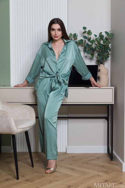 Медленно и эротично стягивая с себя шелковый костюм и уверенно поворачиваясь к камере с разных ракурсов, элегантная женщина с удовольствием оголила перед нами свои натуральные титьки и задницу, а потом развалилась на стуле с раскрытой рогаткой и предоставила нам возбуждающий вид на сочную бритую письку с прической на лобке.