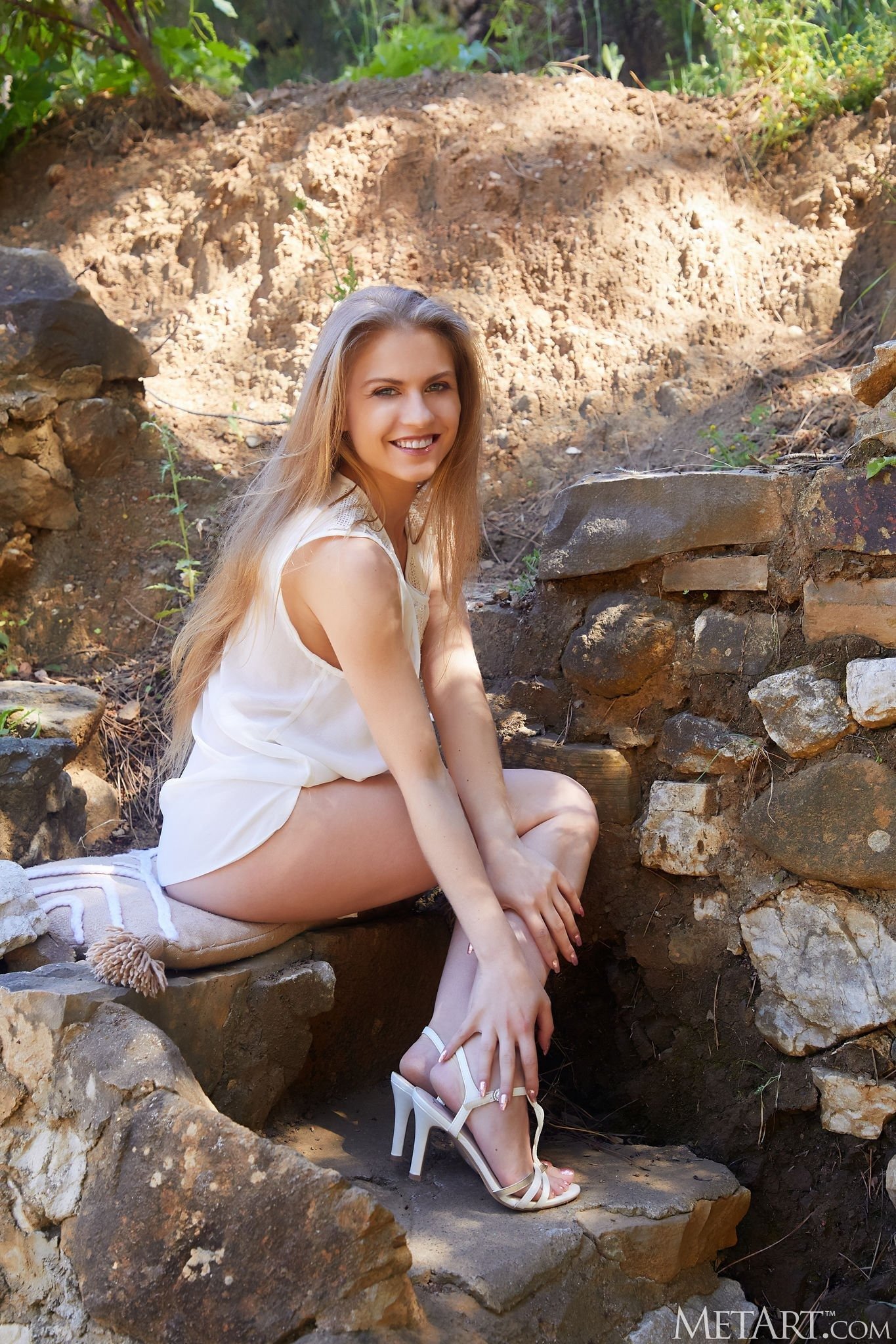 Игриво засветив на камеру свою раскрытую промежность без трусов, а потом сняв с себя короткое платье, голая барышня с маленькими плоскими титьками уверенно изгибается на природе в самых развратных позах и возбуждающе светит своей бритой губастой писькой между ног.
