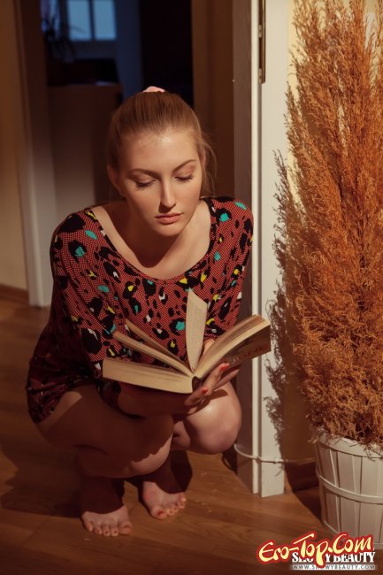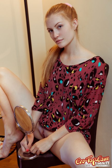Прелестная голая рыжая телочка с волосами собранными в хвостик с невинным видом читала книжку и немного загрустила. Намереваясь развлечься, мадемуазель принялась развратничать и светить бритой соблазнительной писькой, и, не остановившись на этом, полностью лишила себя одежды. Под одеяниями скрывалась тонкая талия и небольшая грудь с соблазнительными розовыми сосками. Неподалеку от соблазнительницы стояла тарелка с пончиками и молодка не удержалась и полакомилась ими, с такой-то фигуркой ей можно позволить иногда себя побаловать мучным.