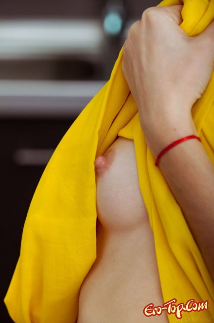 Рыжая с маленькими сиськами и милым лицом зашла на кухню, но так как готовить красотке было лень, она начала строить красивые большие глазки и игриво светить интимными местами. Задрав желтое платье, под которым не было нижнего белья, озорница похвастала сочной попкой, а обнажившись полностью, продемонстрировала маленькие сиськи и узкую бритую киску.