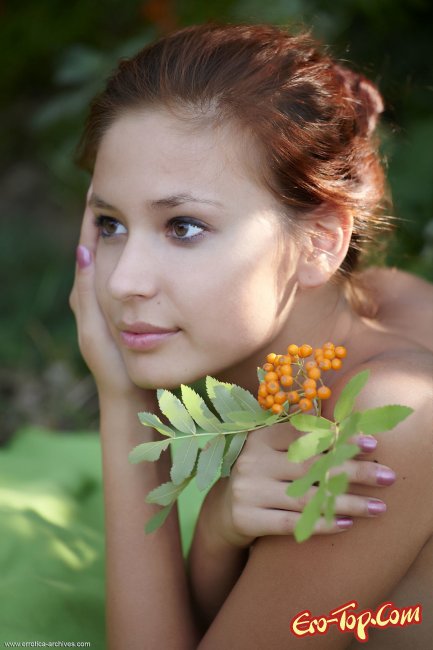 Рыженькая красотка отправилась в лес, где в полностью обнаженном виде начала трогать свою маленькую грудь, а так же расставлять ноги, показывать бритую киску. Заранее расстелив на земле большое полотенце она встала раком и уже более подробно показала сексуальное тело.