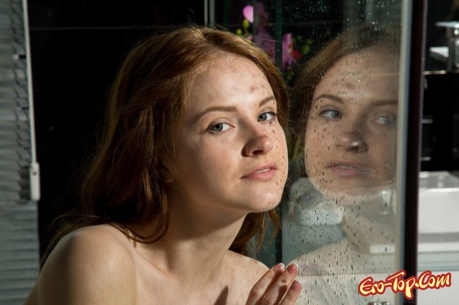 Привлекательная рыжеволосая девушка решила раздеться и забраться в душевую кабинку, начав внутри тереться об стекло и показывать стройное тело. В будущем она облилась водой и будучи мокрой продолжила начатое, трогая себя за маленькую грудь и бритую киску.