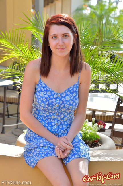 Гуляя по городу симпатичная рыжеволосая девушка в красных кедах решила продемонстрировать сексуальные части своего тела. Выбирая подходящие места она светила натуральной грудью, немного приспуская платье, а подымая его показывала свою гладенькую киску.