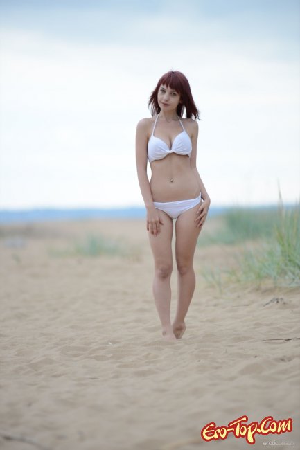 Симпатичная зеленоглазая девушка выйдя к морю начала снимать с себя белый купальник. Полностью раздевшись красотка принялась сексуально позировать, показывая все прелести своего стройного тела, а в частности большую натуральную грудь и максимально побритую пилотку.