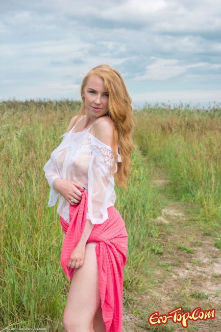 Привлекательная рыжеволосая девушка выбравшись на природу к озеру начала эротично раздеваться и позировать на коврике. Полностью оголившись красотка решилась забраться в воду и засветить все части своего сексуального тела, в том числе натуральную грудь и пилотку с рыжими волосиками на лобке.