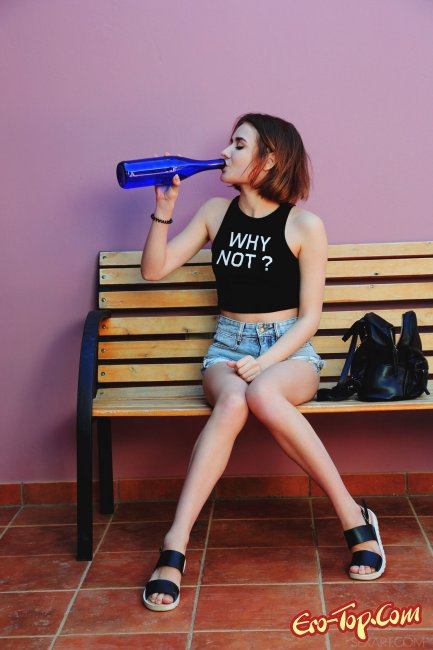 С целью перекусить, молоденькая девица устраивается на лавочке и берется эротично кушать, параллельно медленно раздеваясь и засвечивая маленькие сиськи с торчащими сосочками, а так же начиная играть с бутылкой. Лишившись джинсовых шортиков, очаровательная крошка ощущает наслаждение, стараясь показывать бритую письку, в которой уже находилась выше упомянутая тара.