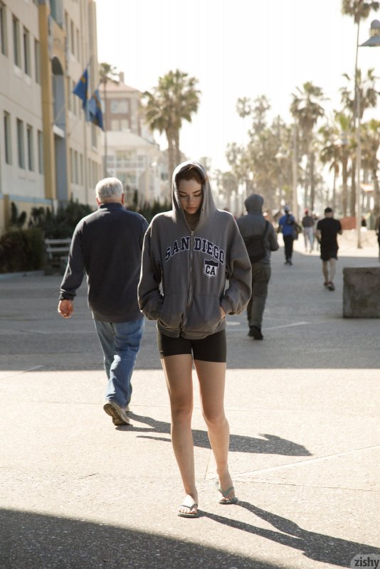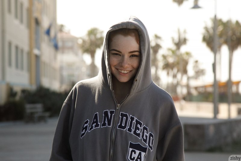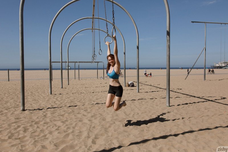 Оказавшись на пляже, достаточно сексуальная рыженькая девушка в веснушках на лице и руках старается скинуть по максимуму вещей и попозировать в разных позициях. Чаще всего молоденькая крошка располагается на песке, немного оттопыривая топик и засвечивая сочную натуральную грудь, при этом раздвигая промежность в шортиках.