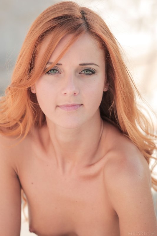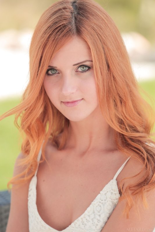 Устроившись на садовом диванчике, молодая рыжая милашка медленно сняв белое платье начинает эротично прогибаться раком, оттопыривая сочную попку. Поглаживая себя руками худышка засвечивала маленькие сиськи, а раздвинув промежность подробно продемонстрировала возбуждающую бритую письку.