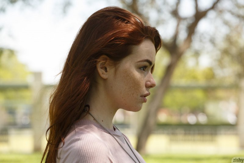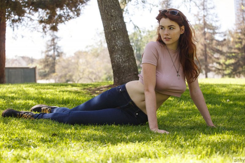 Красивая рыжеволосая девушка с веснушками и пухлыми губками, нарядившись в обрезанный топик и джинсы, отправилась гулять на улицу, с радостью позируя и ощущая желаемое удовольствие. В процессе сексуальная стройняшка засвечивала плоский животик и немного выглядывающие натуральные сиськи.