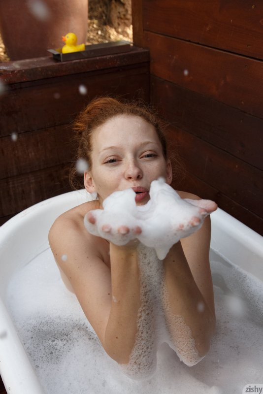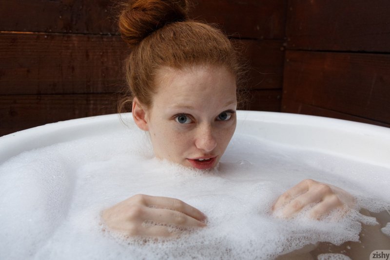 Не обременённая комплексами рыжая баба в очках и халатике позирует перед камерой, а раздевшись купается в пенной ванне, получая от этого процесса удовольствие. Таким образом сексуальная девушка с натуральными дойками делает акцент на гладко выбритой письке, порой сжимая доки руками, усиливая наслаждение.