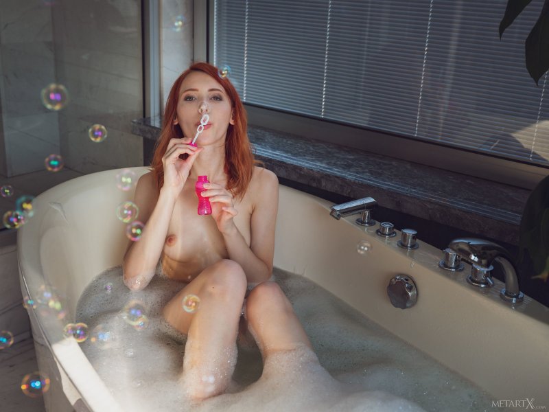 Обаятельная проказница с рыжими волосами и упругой попой резвится в ванне перед фотокамерой, купается там и пускает мыльные пузыри. Таким образом сексуальная красавица с маленькой грудью продемонстрировала не только мокрую задницу, но и бритую киску, порой нежно проникая пальцами во влагалище.