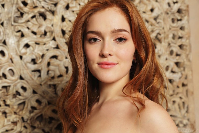 Обаятельная рыжая девушка с милой улыбкой в легком полупрозрачном платье, устроившись на лежанке, эротично позирует и в будущем медленно оголяет сочную задницу. В обнаженном виде сексуальная баба с плоской грудью, лежа на животике, так же акцентирует внимание на бритую письку.