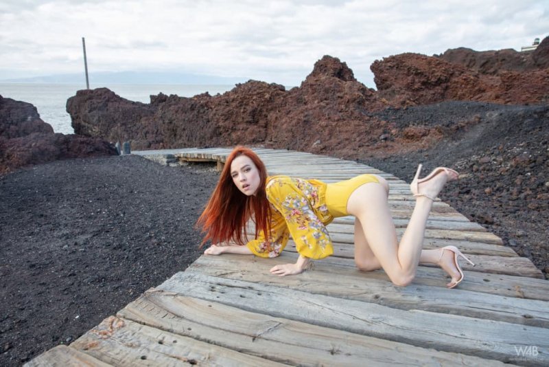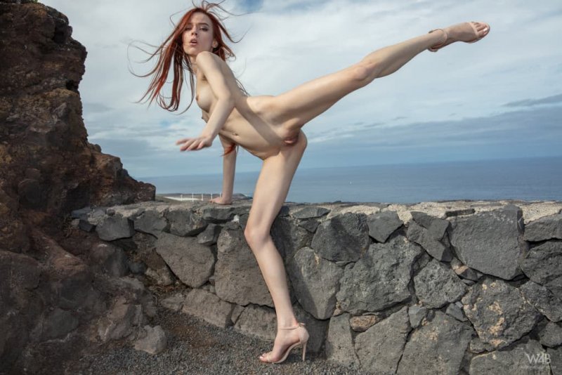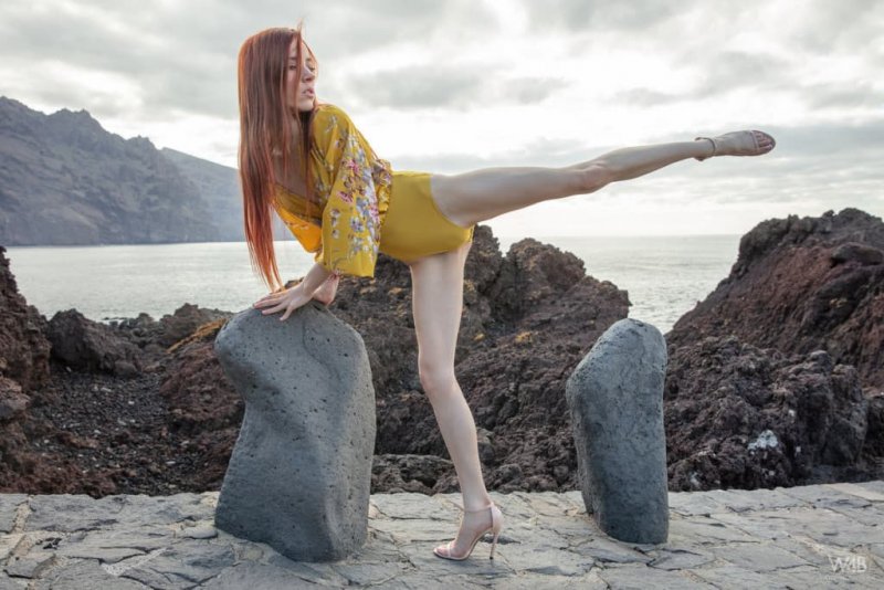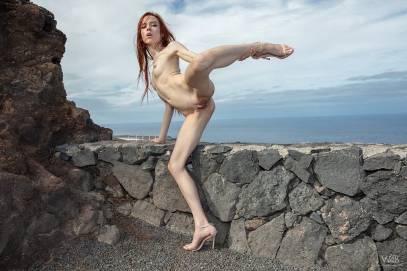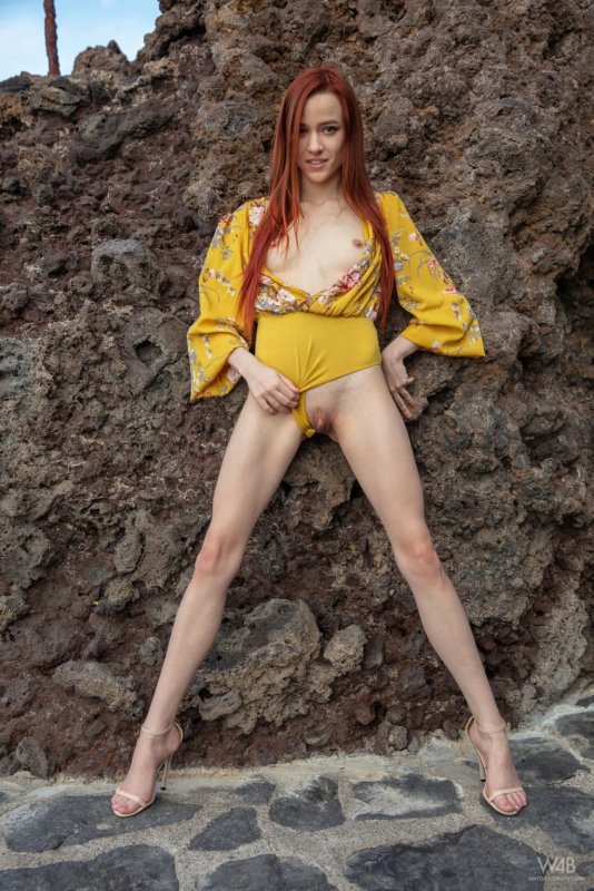 Найдя уединенное место, тощая рыжая сучка в желтом костюме хочет расслабиться и, чтобы ничего ей не мешало, танцует голой. Девушка грациозно и изящно поднимает свои длинные ноги так высоко, что хорошо видно ее голую бритую киску, а затем она с удовольствие засовывает в нее свои длинные влажные пальчики.