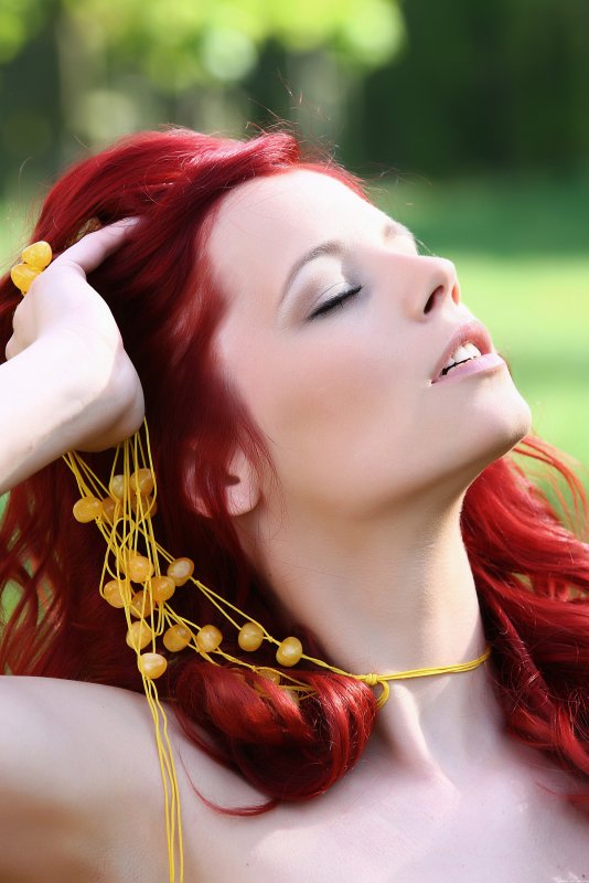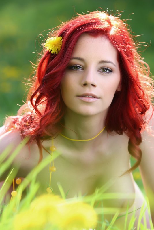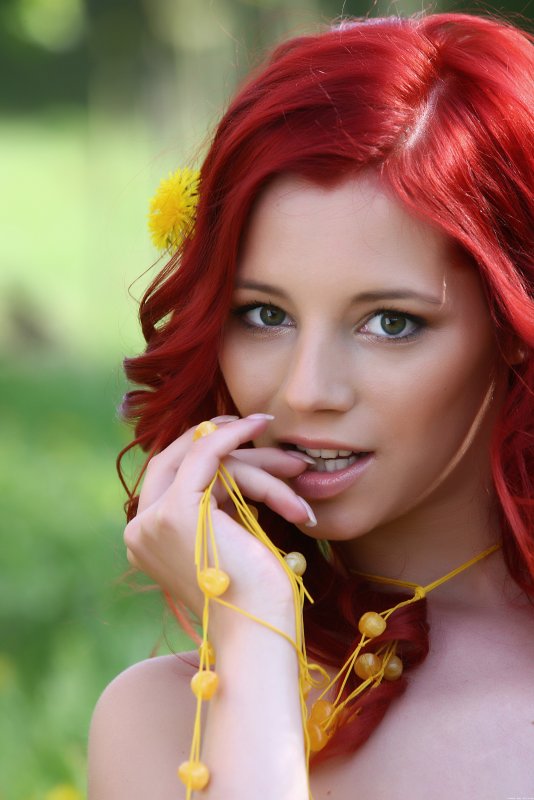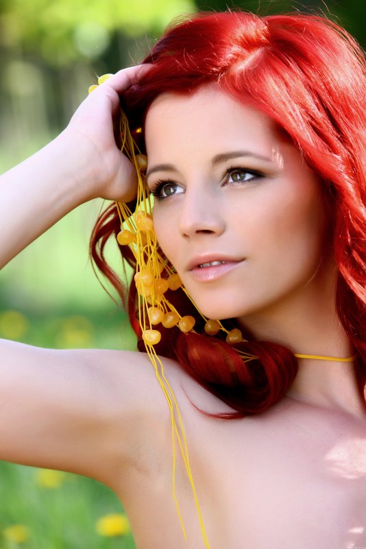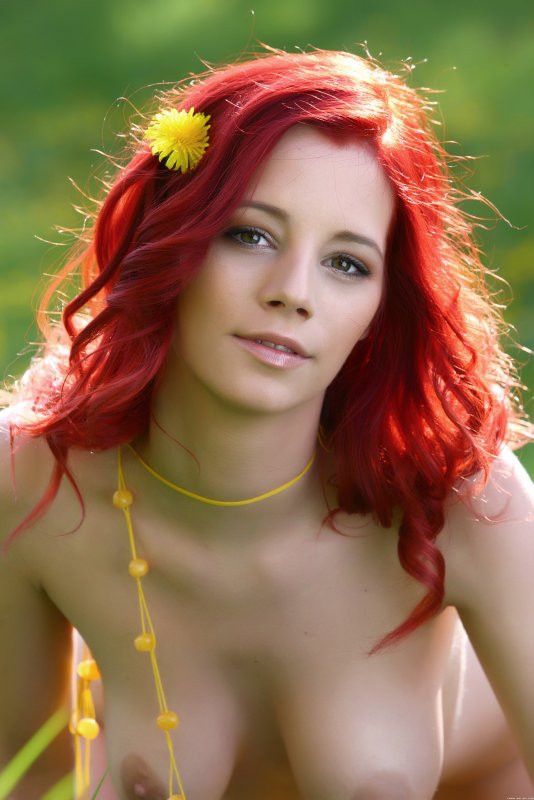 Рыжая девушка позирует голой на природе