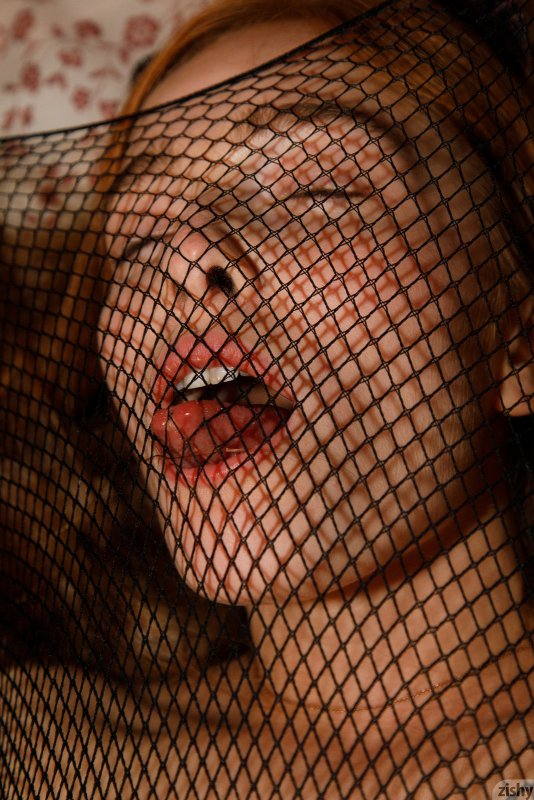 Развратная рыжая девица в прозрачном сетчатом наряде соблазнительно изгибается всем телом в разных позах, лежа в большой кровати. Сексуальная рыжуха с маленькими титьками игриво светит через большую дырку в промежности своей голой волосатой писькой с рыжим пушком.