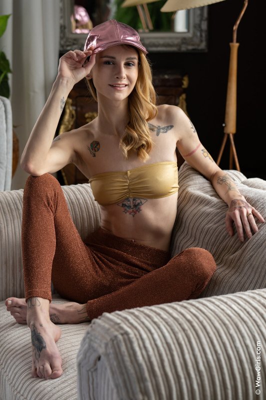 Молодая худая рыжуха с яркими татуировками постепенно разделась до гола, выставив на показ свою бритую сочную письку с заросшим мохнатым лобком. Тощая шалунья вовсю светит своими миниатюрными титьками, а затем высоко задирает маленькую упругую задницу и раскрывает перед камерой голую промежность.