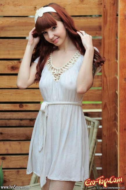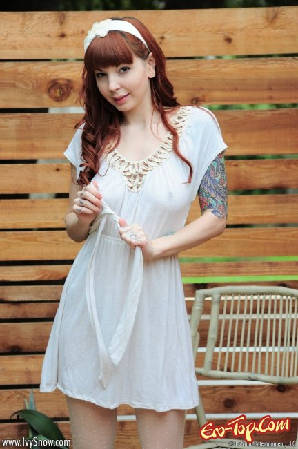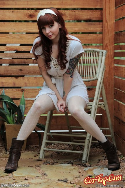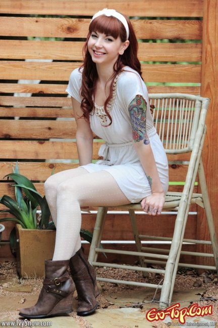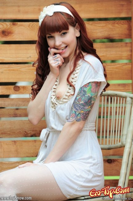 Рыжая красотка, юная озорница, выйдя на свежий воздух, начала возбуждающе шалить перед фото камерой. Девушка с цветными татуировками по всему телу эротично позировала и игриво задирала легкое платье, под которым ничего не было кроме белых чулков, обнажая грудь и киску с интимной стрижкой "узкая взлетная полоса". Под конец фото сета, развратница раздвинула ножки и ввела в сладкую киску пальчики, чтобы немного по-мастурбировать и добавить пикантности происходящему в кадре.
