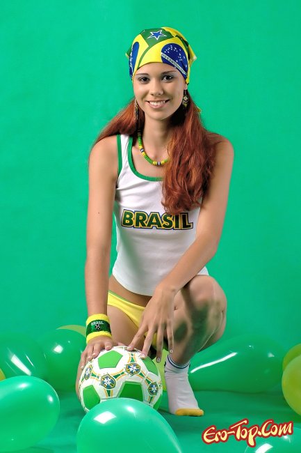 Все болельщицы преданные своим футбольным командам. Сегодня вы сможете насладиться наготой болельщицы бразильской футбольной команды, которая с большим удовольствием фотографируется на фоне бразильского флага и демонстрирует свою возбужденную киску.
