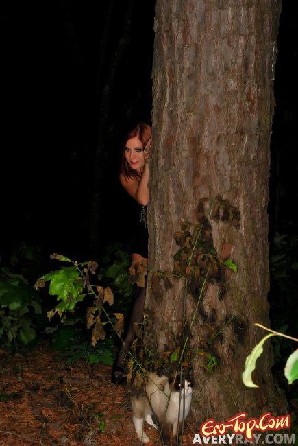 Сексапильная рыжая девушка решила сделать себе ночные фото для своей коллекции. Она эротический позирует воз огромного ствола дерева в коротенькой черной юбке. Потом крошка снимает с себя лифчик и прикрывает красивые сиськи больших размеров руками. Задрав юбочку куколка засветила своей классной жопой, а потом разлеглась на сырой земле раскинув по ней длинные волосы.