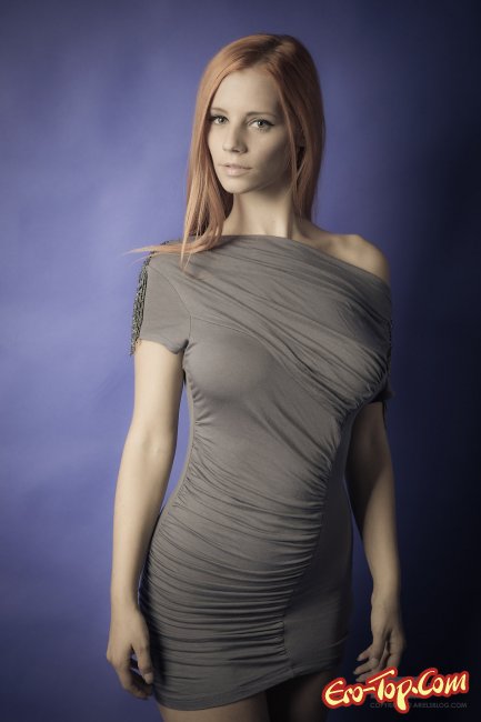 У этой симпатичной модели с длинными рыжими волосами очень красивая фигура в обтягивающем платье. Девушка стоит на высоких каблуках и начинает раздеваться. Сперва куколка показывает фигурку в нижнем белье, а потом снимает лифчик с трусиками и демонстрирует большие сиськи, прикрывая ладонью волосатый лобок.