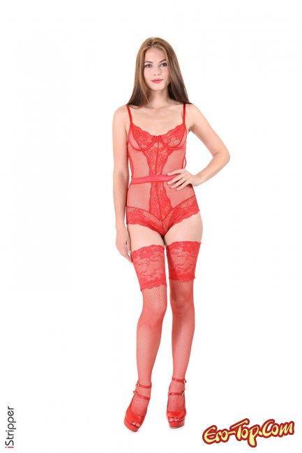 Привлекательная девушка в возбуждающем красном корсете и чулках принялась эротично позировать перед фотокамерой. В процессе, красотка старается поворачиваться разными сторонами своего соблазнительного тела, а спустя несколько минут принимается медленно раздеваться, стягивая своё бельё и засвечивая голые сиськи и гладко выбритую письку.
