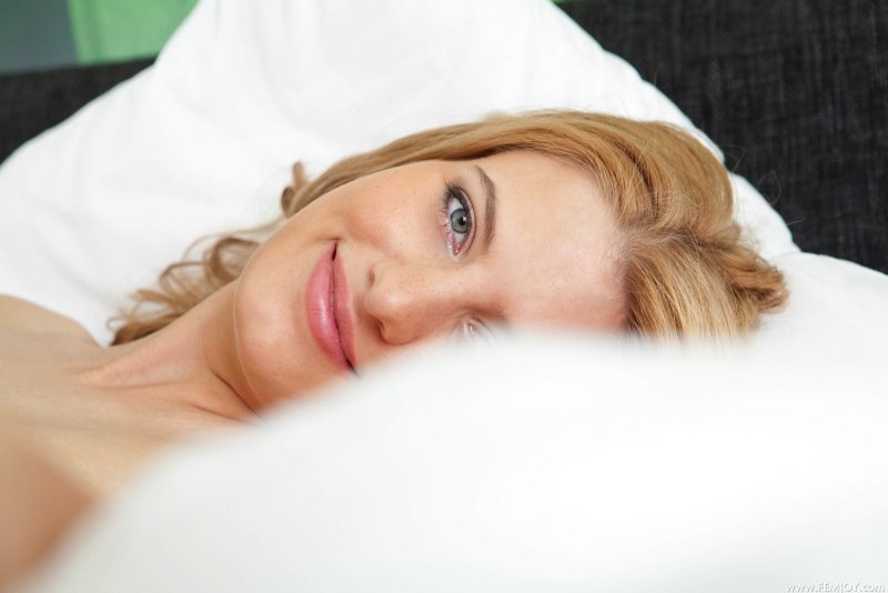 Устроившись в постели, обнажённая и довольно привлекательная девушка со светлыми волосами меняет разные ракурсы и медленно обнажается перед нами. А лёжа на спине, сексуальная стройняшка с маленькой грудью раздвигала ноги и крупным планом демонстрировала волосатую письку с лобком.